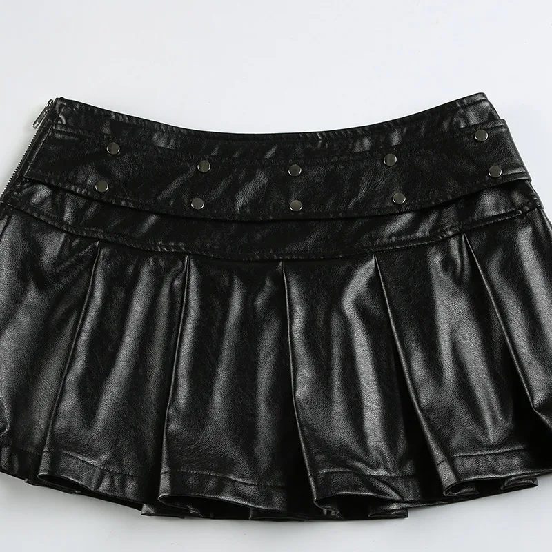 2025 New Vintage Dark Punk Rivet Faux Pu Leather Pleated Skirts Y2K Grunge Streetwear Women Gothic Dropped A-Line Mini Skirt Zip