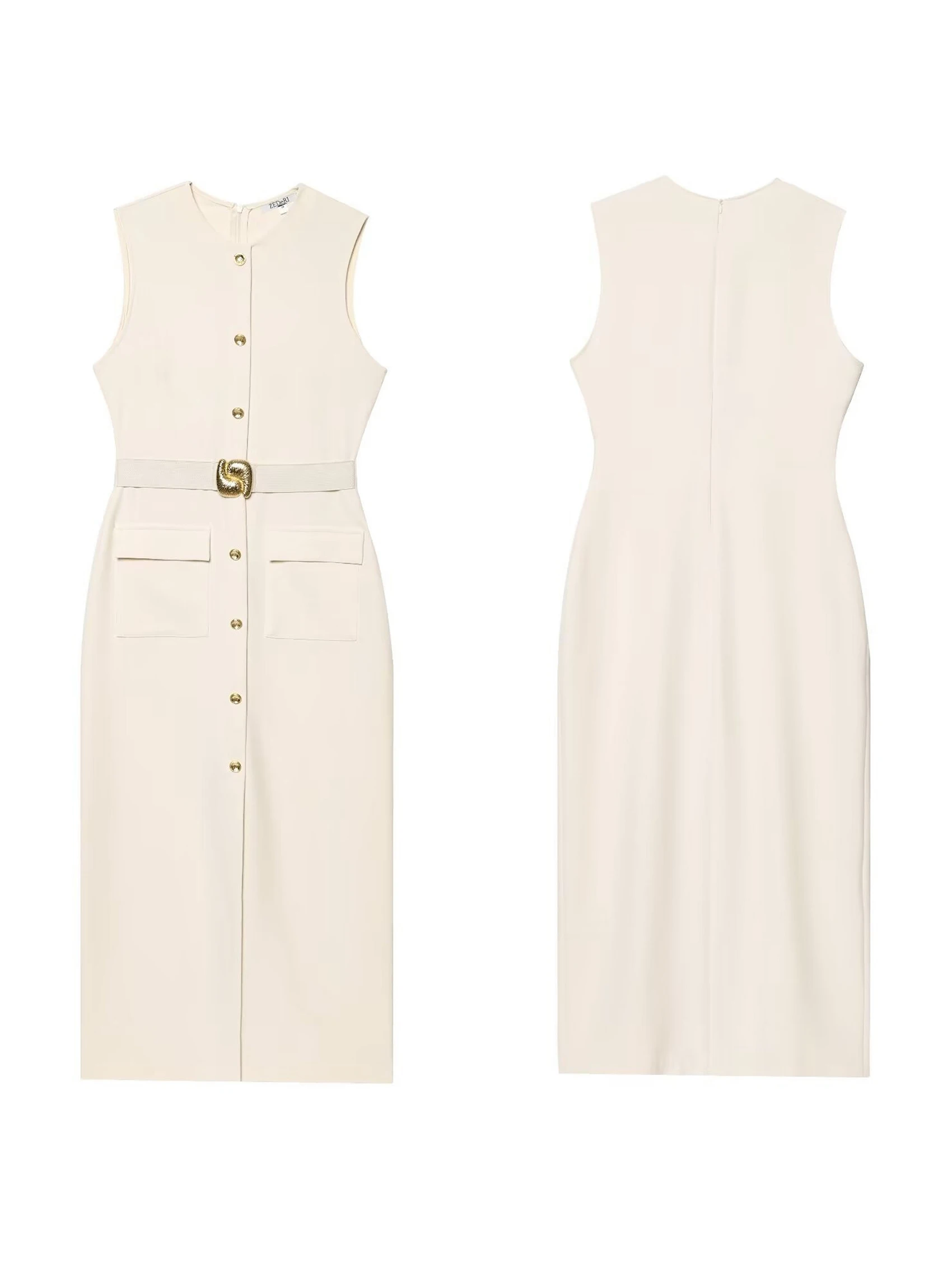 Featuring a crew collar and a button-down front that's cinched together with a coordinating belt buckle, this formal dresses will take you from desk to drinks in a minute
