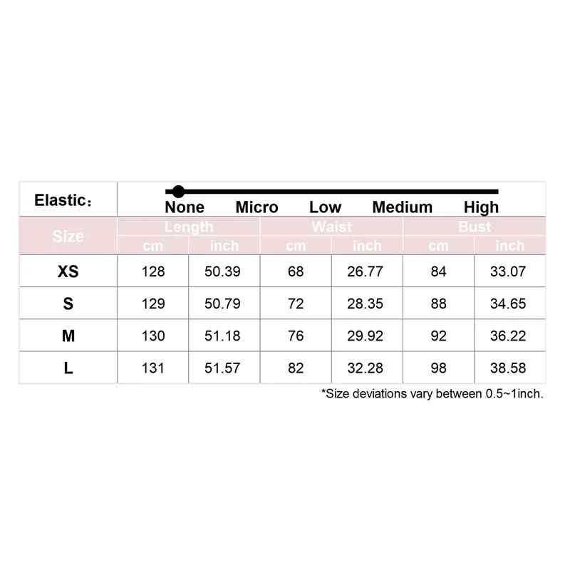 XS=US2=UK6=EU34(cm / inch) Bust: 84.0 / 33.07, Length: 128.0 / 50.39, Waist: 68.0 / 26.77