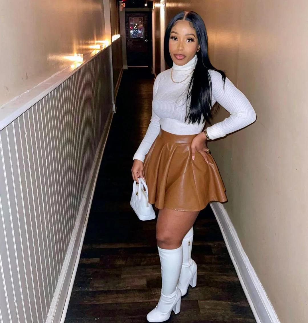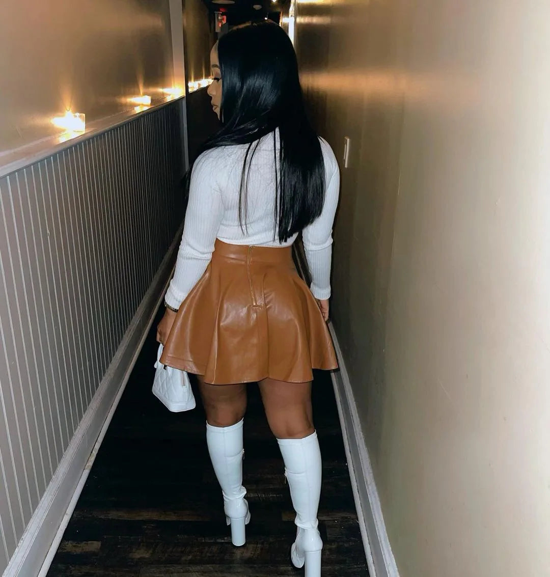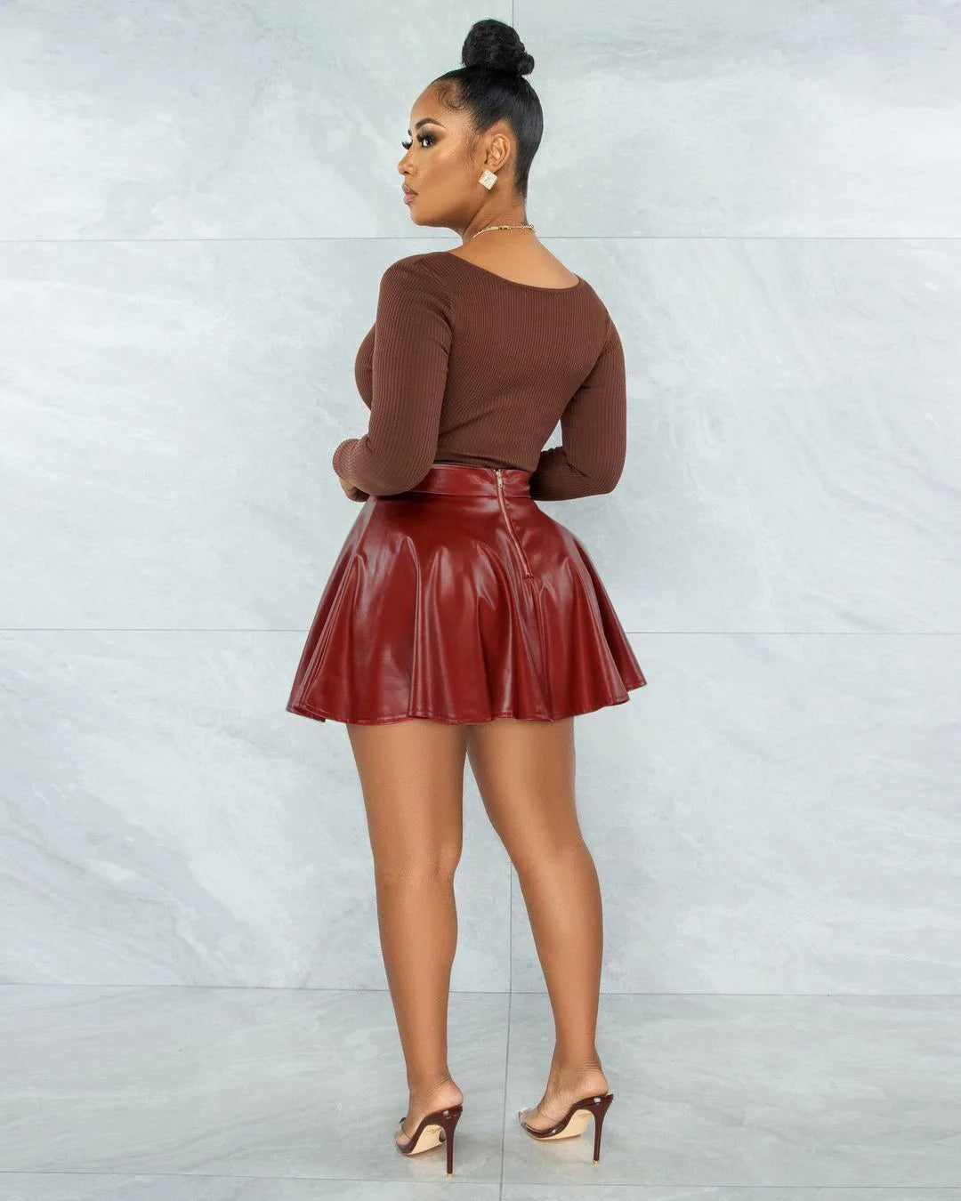 Descubre la elegancia casual con esta minifalda de cuero sintético con corte acampanado. Su diseño de cintura media y vuelo sutil la convierte en una pieza versátil perfecta para el día a día, combinando comodidad con un toque sofisticado. El corte flare añade movimiento a cada paso, creando una silueta femenina y favorecedora.