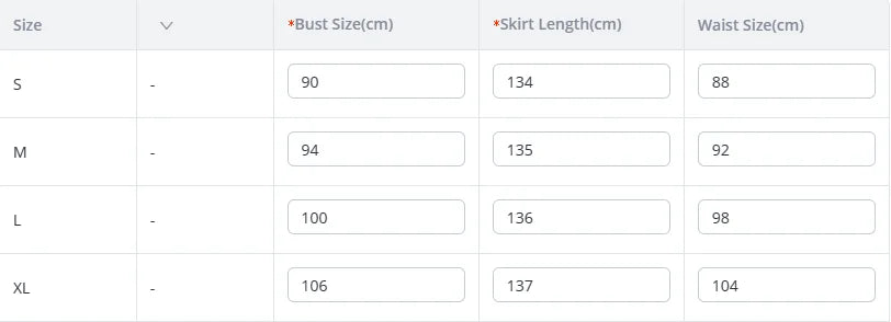 Size S: Bust 90CM-----Waist 88CM-----Length 134CM