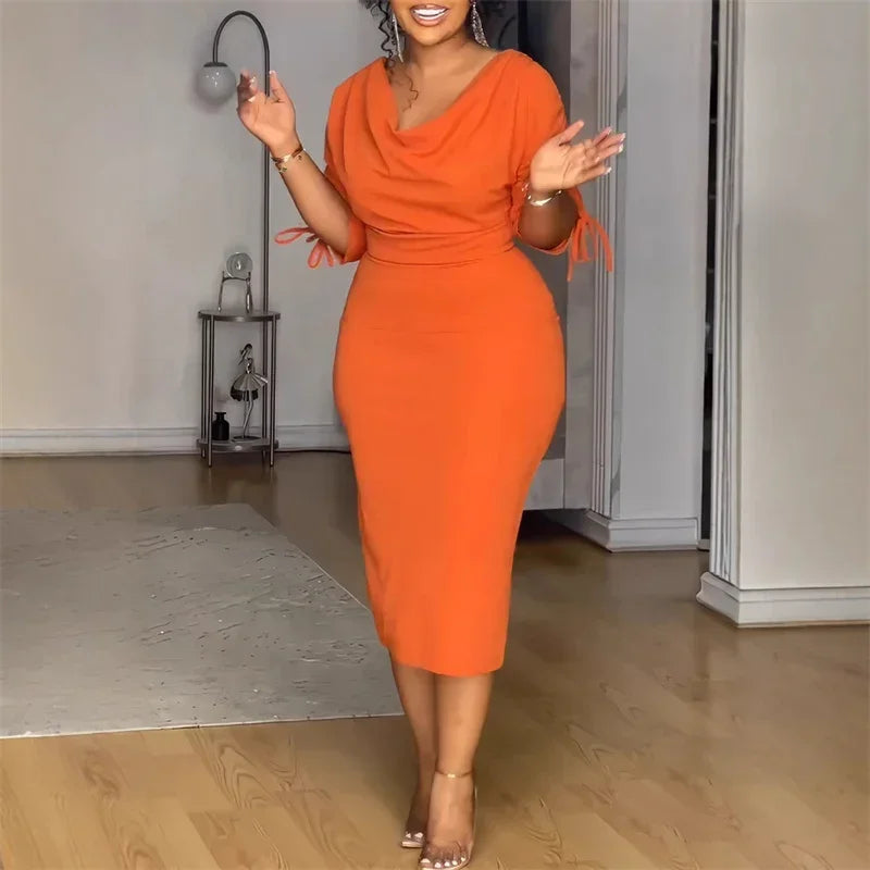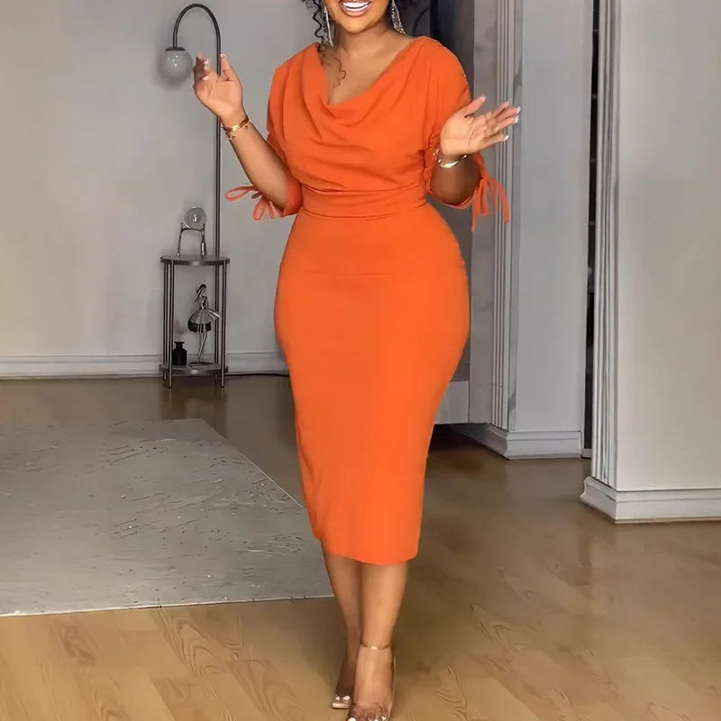 Pencil Midi Dress - Vintage Office Drawstring Ruched