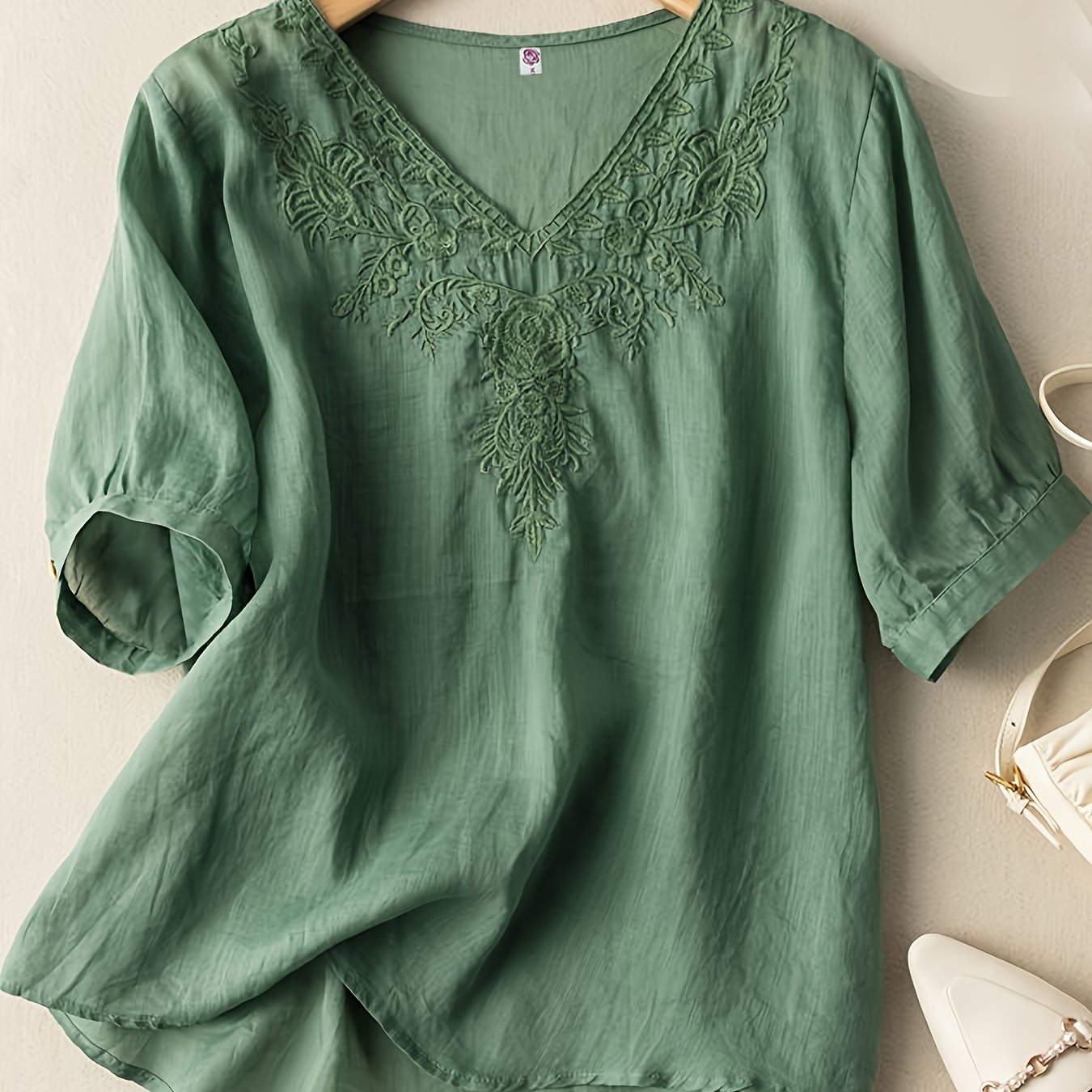 Polera Bordado Floral Escote V - Vintage Manga Corta Suelta