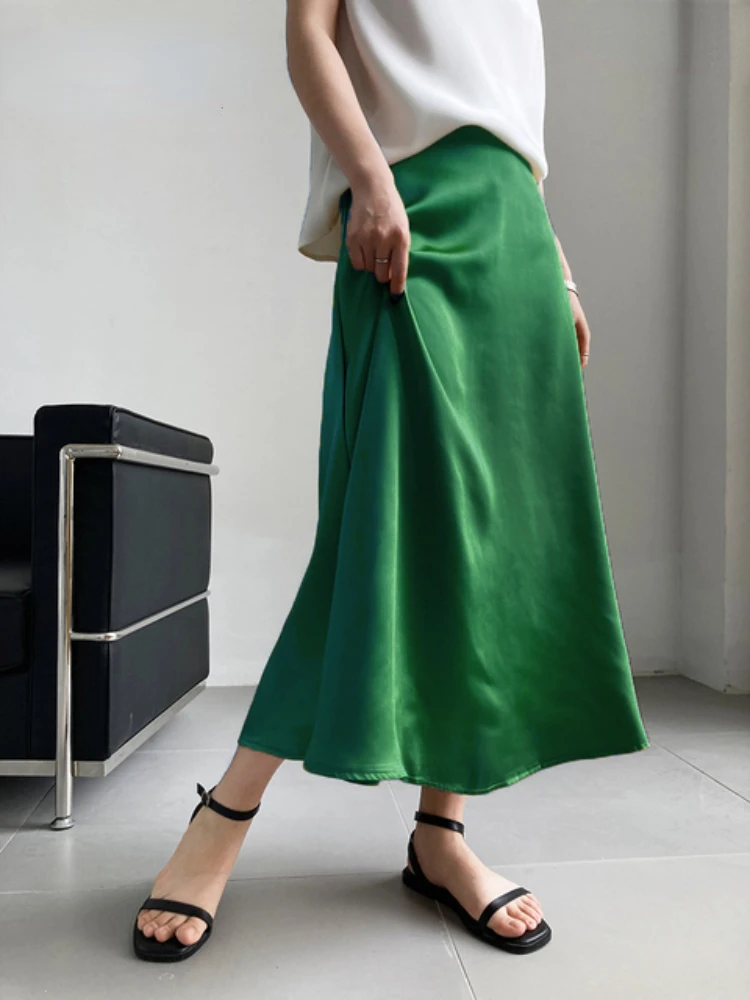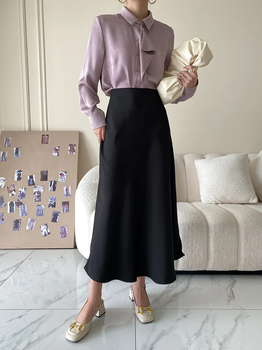 Satin Long Skirt - High Waist A-Line Black