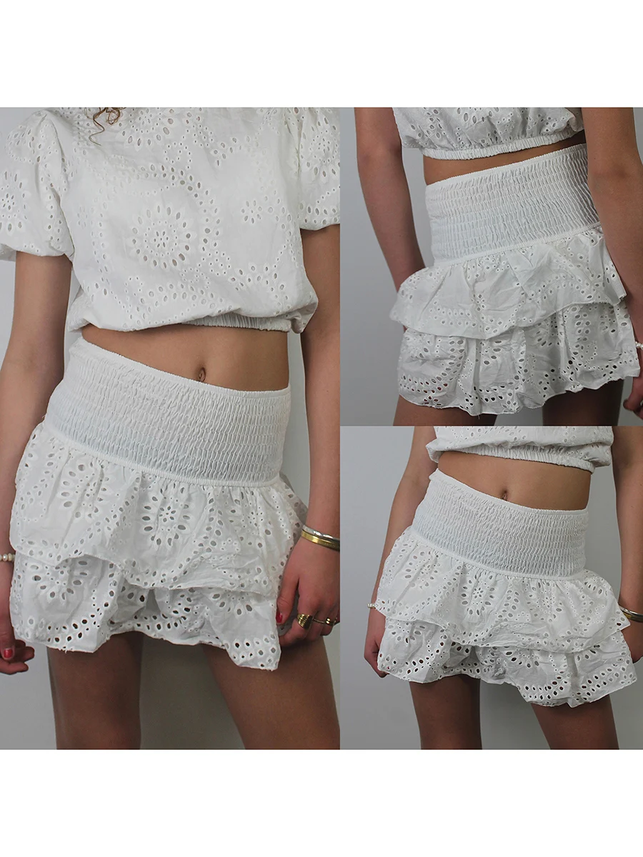 Women's Shirred Mini Skirt A-Line Pointelle High Waist Layered Ruffle Skirt for Summer Party Club