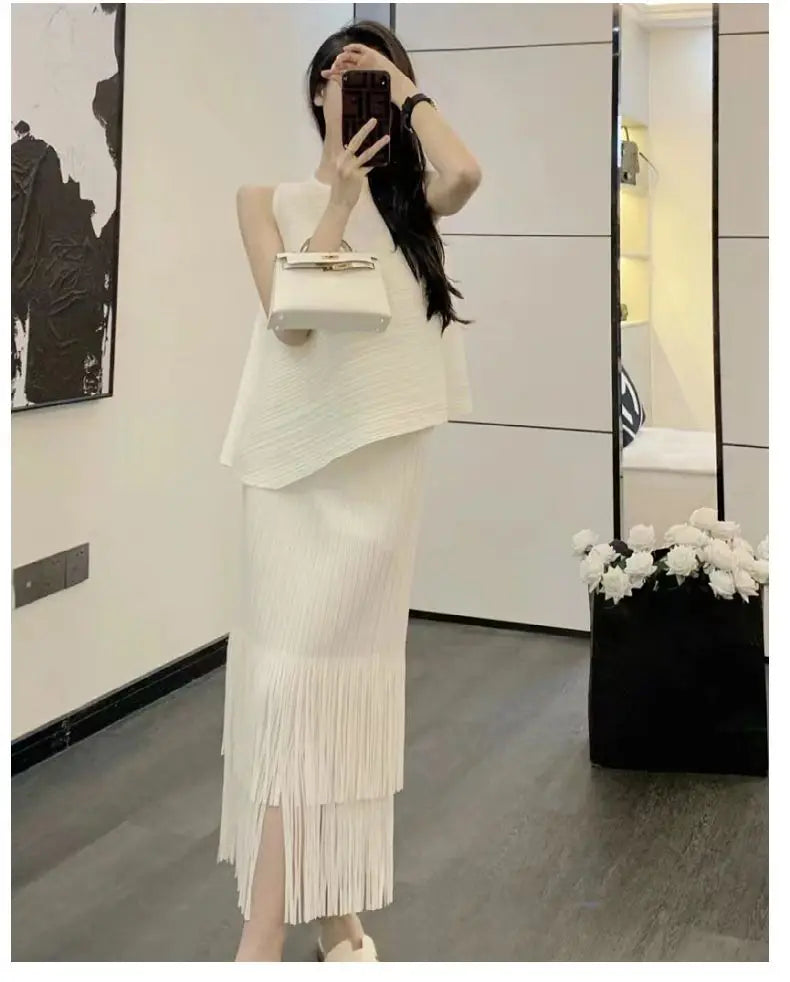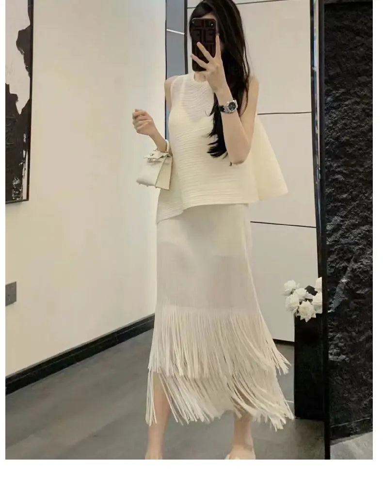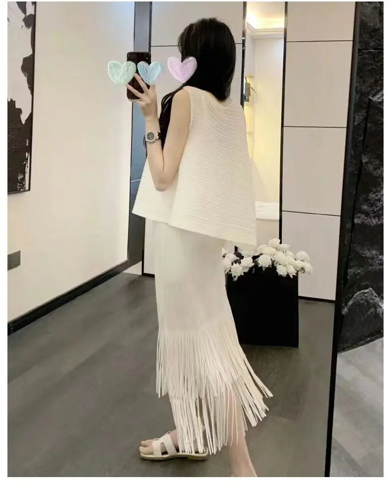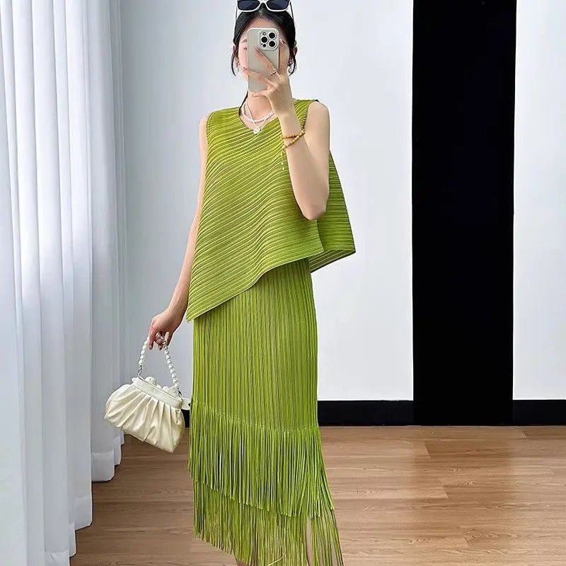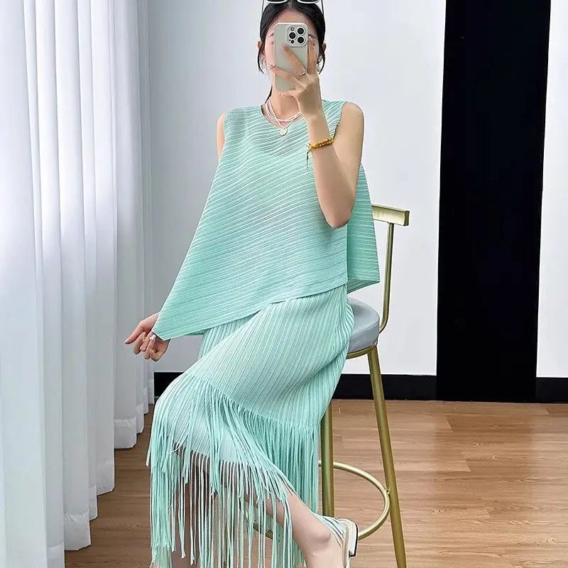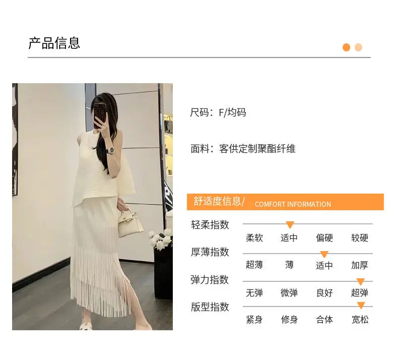 Descubre este conjunto de dos piezas con flecos (tassel) que combina elegancia profesional con diseño moderno. El top sin mangas (sleeveless) con cuello redondo (O-neck) y la falda línea A (A-line) con cintura alta elástica crean un look sofisticado perfecto para oficina, eventos formales o salidas elegantes. Confeccionado en tejido blended de poliéster mediante técnica non-woven, este conjunto es perfecto para quienes buscan piezas coordinadas que ofrecen estilo casual profesional y comodidad durante todo el día. El diseño loose (holgado) favorece todas las figuras mientras los flecos añaden movimiento elegante.