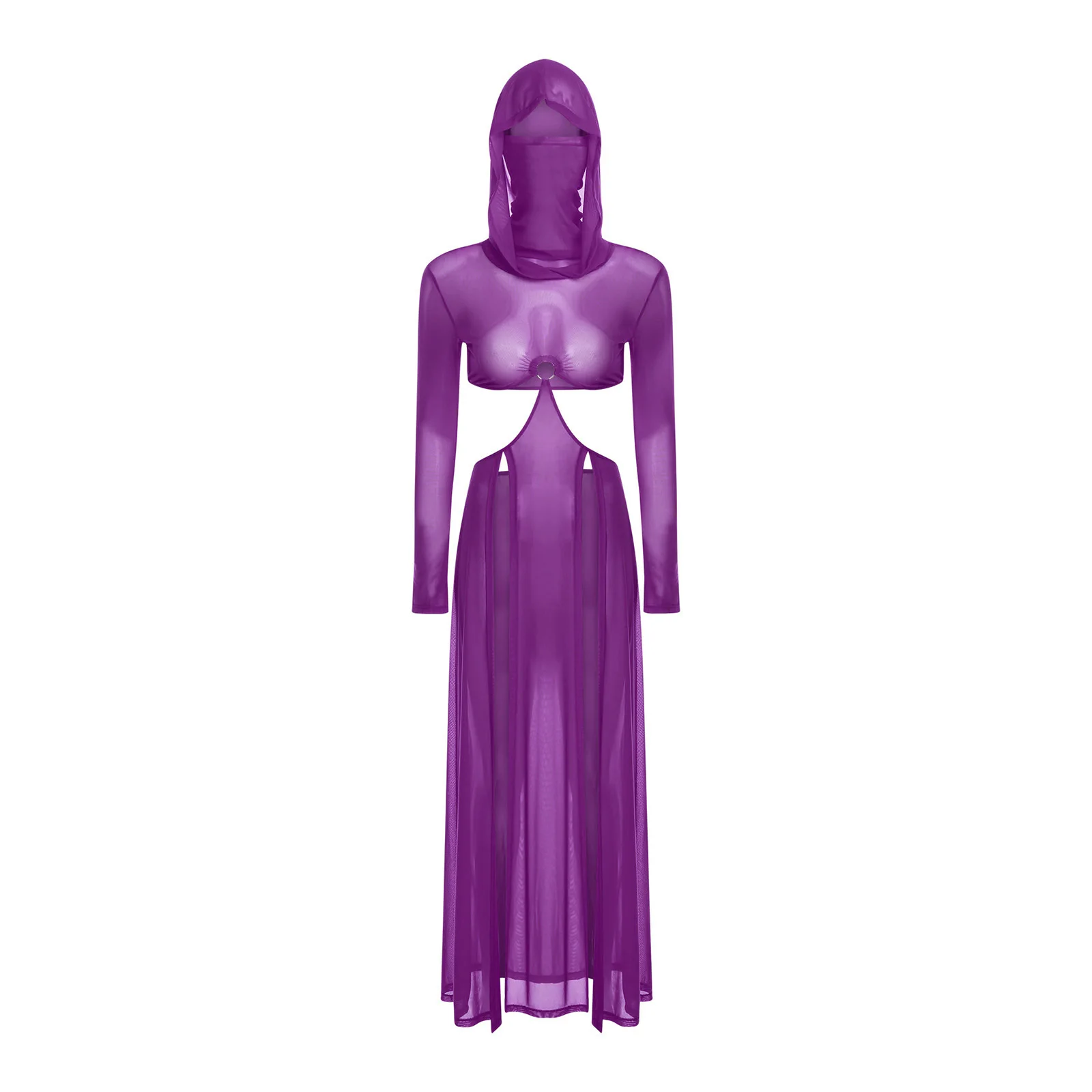 A sheer coverup dress for women, is designed with hooded, long sleevees, high waist, high slit maxi dress, with integrated face mask.
